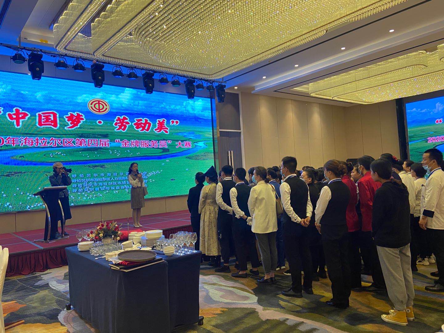 内蒙古呼伦贝尔市海拉尔区总工会为大力弘扬工匠精神,建设知识型、技能型、创新型劳动者大军,推动疫情后海拉尔区餐饮行业的复工复产,提振行业信心,促进行业内服务技能交流与学习,举办“中国梦·劳动美”2020年海拉尔区第四届“金牌服务员”大赛,来自海拉尔区14家大型餐饮企业的50余名餐厅、客房服务精英参加了本次服务技能大比拼。此次比赛共有中餐宴会摆台、中式铺床两个比赛项目。赛场上,参赛选手以精湛的技艺、优美的动作完成了操作技能比赛,动作非常连贯,娴熟的技能赢得了现场观众阵阵掌声,充分展示了选手们操作技能的熟练性、规范性和美观性。
