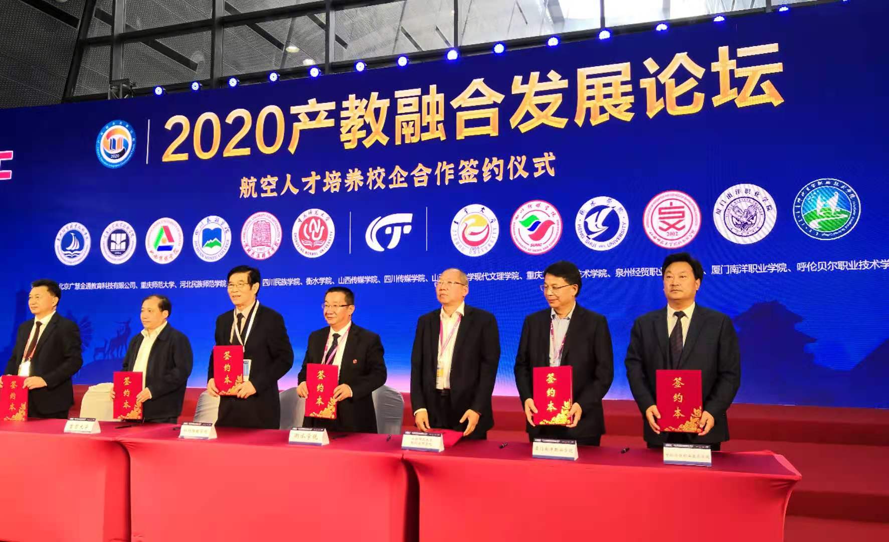 2020年11月8日,学院院长张廷率领教务处处长田朝晖,招就处处长吴涛,商旅系主任伊敏、副主任蒋晓东一行赴湖南省长沙市参加第55届高等教育博览会和2020年全国高校民航服务技能大赛产教融合发展论坛。博览会期间,呼伦贝尔职业技术学院等来自全国的12所大专院校就航空人才培养共同与北京广慧金通教育科技公司校企合作签约。签约仪式在长沙市会展中心隆重举行。