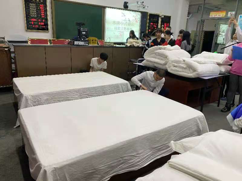 商贸旅游系于2020年11月18日下午在实训楼五楼客房实训室举办了“中式铺床技能大赛”。决赛的评委老师有商贸旅游系党总支书记、系主任伊敏,商贸旅游系副主任蒋晓东 ,教研办主任斯琴格日乐,物流教研室主任郭燕 ,以及指导教师海勃、张金玲、毕玉昕。参加本次比赛的选手有40名同学,最后冲进决赛的共10名同学。经过激烈的角逐 ,来自18级酒店管理特教班的斯仁毕力格、图力古尔同学和19级邮轮大专班的刘艳同学荣获一等奖;来自18级酒店管理特教班的王迪同学、19级邮轮大专班兰玉莹同学、19级旅游服务中专班王海鹏同学获得二等奖;19级旅游服务中专班郭鑫、张宏博同学、19级邮轮大专班吕娜娜、包东艳同学获得三等奖。通过本次技能大赛,同学们展现了自己的独门绝技,同时又切磋了铺床技艺,提高酒店、邮轮管理专业学生中式铺床操作技能的规范性和熟练性,提高服务意识、现场分析与处理问题的能力、语言沟通表达能力和现场卫生安全操作意识、卫生安全操作意识、个性化性服务创新性及心理素质等多方面综合素质。