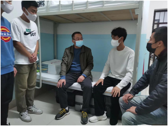 蒋主任一行每到一处,首先向学生们表达了学院的关心与问候,同时也仔细了解学生封校期间的身心状况等,鼓励同学们调整心态,积极适应疫情时期的学习生活,并再三强调:要严格遵守常态化疫情防控期间注意事项、宿舍管理的安全制度与规定;要正确面对,深刻领会国家、学校在特殊时期所提的特殊要求、所采取的特殊管理等;要自觉做核酸检测、每日晨、晚打卡,并注意保持宿舍卫生整洁,如有异常情况,要及时报告,希望我系师生一起齐心协力,共克时艰。