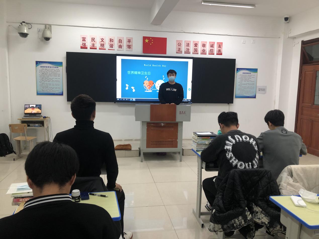 为广泛开展科普宣传和健康教育,积极开展新冠肺炎疫情相关的心理健康知识教育,各班级组织学生召开世界精神卫生日主题活动,并观看在疫情期间心理调适和青少年在青春期逆反、网瘾等认知方面的公益宣传片,帮助学生了解青少年心理健康问题,掌握疫情期间心理调适方法技巧,提升大学生心理健康水平。