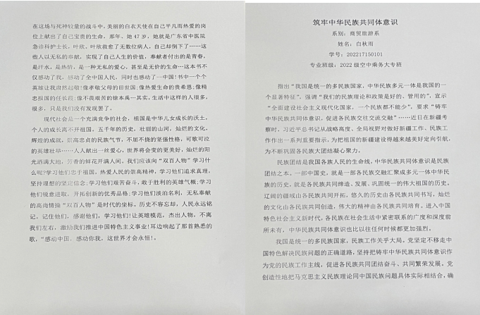 活动发布后,同学们踊跃参加、积极投稿,用文字形式续写民族团结新篇章,同学们的文章内容积极向上,感情真挚,紧紧围绕主题,以新时代青年的角度,结合自身学习、生活实际和感悟体会,融入各民族荣辱与共、命运与共、生死与共的故事,讲述了对铸牢中华民族共同体意识的深刻认识。