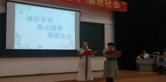 为了更好地引导学生树立正确的世界观、人生观和价值观,深入宣传党和国家的资助政策,加强学生思想道德教育,激励广大学生努力学习、励志成才、报效国家,商贸旅游系于2018年5月3日晚在2号阶梯教室举办“诚信你我、励志圆梦、感恩社会”主题晚会。莅临本次晚会的领导有学院资助中心主任沃红梅、商贸旅游系系主任钱阿丹、学管副主任崔喆及商贸旅游系学工办老师、班主任。