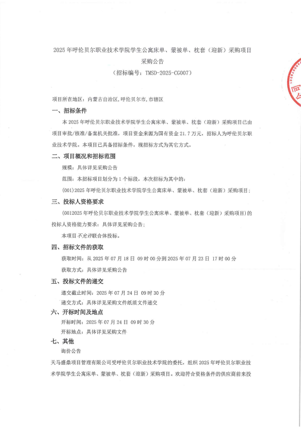 2025年呼伦贝尔职业技术学院学生公寓床单、蒙被单、枕套(迎新)采购项目采购公告(招标编号:TMSD-2025-CG007)