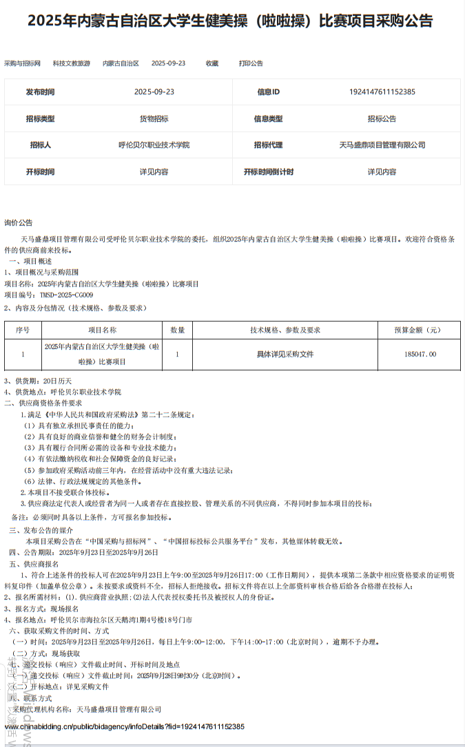 2025年内蒙古自治区大学生健美操(啦啦操)比赛项目采购公告