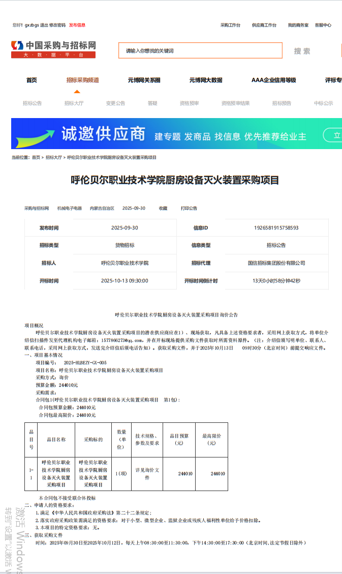 呼伦贝尔职业技术学院厨房设备灭火装置采购项目公告
